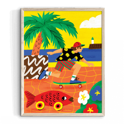 Mi-plage, mi-skatepark, c’est ça le remblai des Sables d’Olonne ! Cette illustration met en scène un skateur décontracté aux côtés d’un poisson à roulettes géant, le tout baigné de couleurs chaudes et tropicales. Une composition dynamique, drôle et graphique qui ne laisse personne indifférent.
