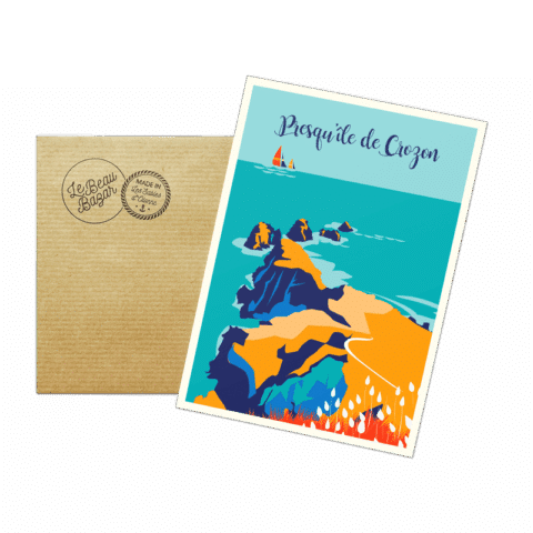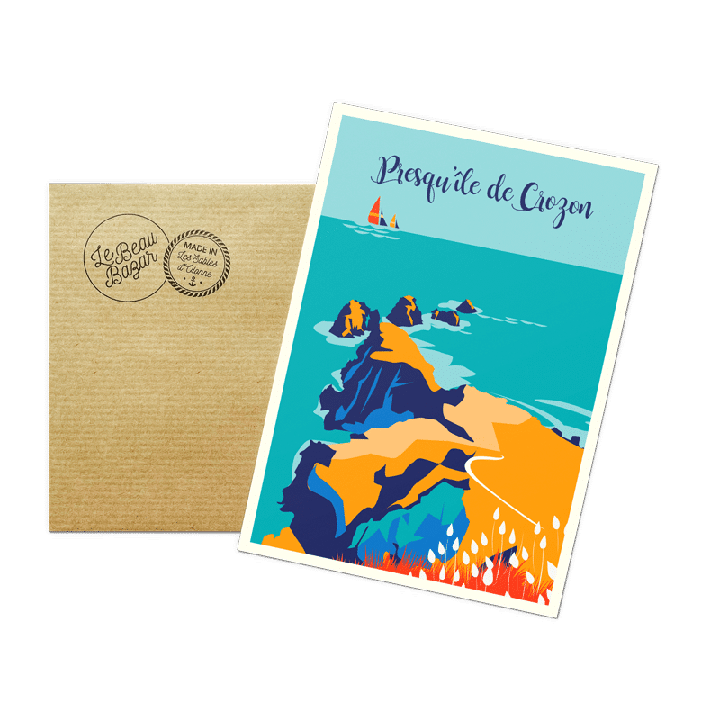 La Presqu’île de Crozon, joyau du Finistère, s’invite sur cette carte postale pleine de couleurs et de lumière. Une création graphique originale qui évoque la beauté naturelle et les panoramas grandioses de la Bretagne. Idéale à envoyer ou à encadrer.Cette carte postale est dessinée aux Sables d’Olonne et imprimée en Vendée sur un papier 350g/m² Couché Mat.