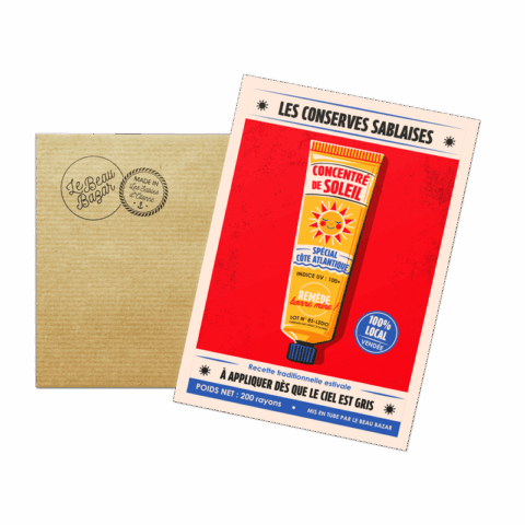 Recette exclusive, 100% locale : le Concentré de Soleil des Conserves Sablaises ! Présenté comme un tube de crème solaire sur fond rouge vif, cette carte postale illustrée est un clin d’◊il plein d’humour aux journées grises et au manque de soleil.