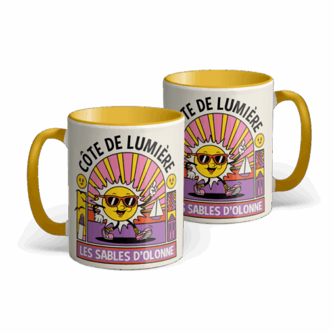 Le café du matin a un goût différent quand il est servi dans le bon mug. Celui-ci, avec notre mascotte soleil dorée et ses couleurs chaudes qui rappellent la Côte de Lumière, c’est un peu comme avoir les Sables d’Olonne à portée de main tous les jours.