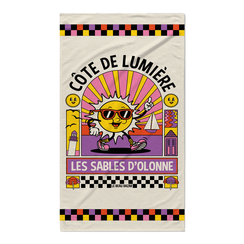 Impossible de passer un été aux Sables d’Olonne sans elle. Cette serviette de plage met à l’honneur notre mascotte soleil des Sables, ce personnage haut en couleurs qui incarne parfaitement l’esprit de la Côte de Lumière : chaud, joyeux et plein de vie.